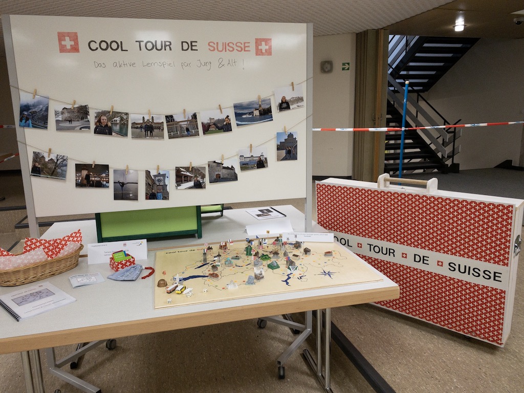 Die Ausstellung wirkte schon alleine durch die Vielfalt der bearbeiteten Themen. So gab es beispielsweise ein mehrfunktionales Paletten-Bett zum Thema Schlafkultur, ein Schweizer Brettspiel zum Thema „cool tour de Suisse“ mit Einbettung zahlreicher Sehenswürdigkeiten, ein Wasserrad zum Thema Wasserkraft oder auch zwei Tischchen mit Spezialscharnieren zum Thema Tischkultur zu bestaunen. Das übergeordnete Projektthema COOL TOUR wurde spürbar, die kreative Auseinandersetzung der Schülerinnen und Schüler mit dem übergeordneten und wortspielerischen Projektthema beeindruckte.