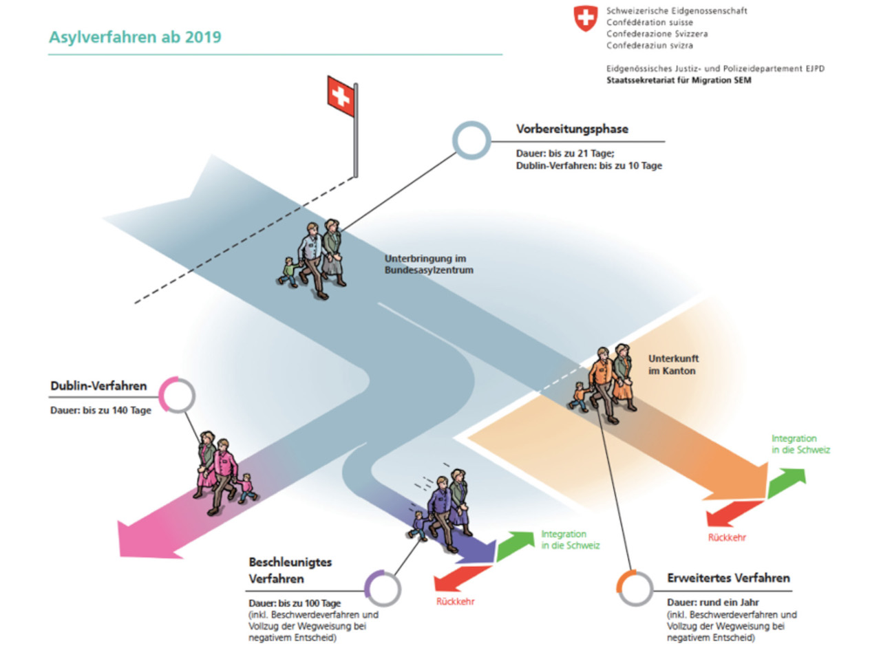 Grundsätzlich hat jeder Mensch das Recht in einem fremden Land Asyl zu beantragen, und jedes Land ist dazu verpflichtet, diesen Antrag zu überprüfen. Die Gründe sind Verfolgung an Leib und Leben aufgrund politischer und religiöser Ausrichtung. Hierfür ist das Staatssekretariat für Migration (SEM) verantwortlich. Die Aufnahme erfolgt in den sechs Erstaufnahmezentren, den Bundesasylzentren. Ziel ist es, mittels eines beschleunigten Verfahrens so schnell wie möglich einen positiven oder negativen Entscheid fällen zu können. Hierbei steht den Asylsuchenden ein Rechtsbeistand zur Verfügung.