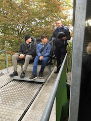 Mit dem Gurtschlitten kann die Wirkung von Gurten bei scheinbar geringen Geschwindigkeiten erfahren und nachvollzogen werden. Unvermitteltes Bremsen des Autos lässt unseren Oberkörper nach vorne schnellen, die Gurten bewahren davor, mit dem Kopf auf die Armaturen oder gar in die Windschutzscheibe zu knallen. Zusätzlich schützt in diesem Bereich auch der Airbag.