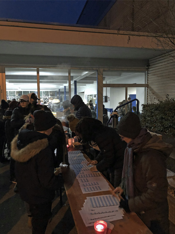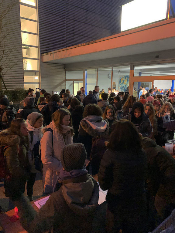 Vor dem Haupteingang wurden die Schülerinnen und Schüler bereits erwartet und durften ein kleines Präsent in Empfang nehmen. Zusammen mit allen Lehrpersonen erwärmten sie sich an einem heissen Punsch und genossen dazu ein Bänzli.