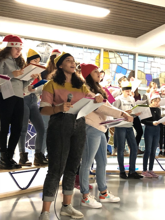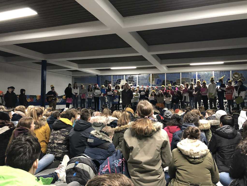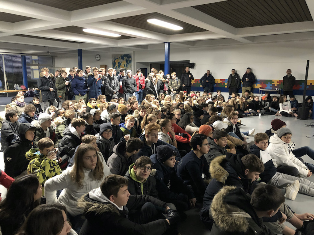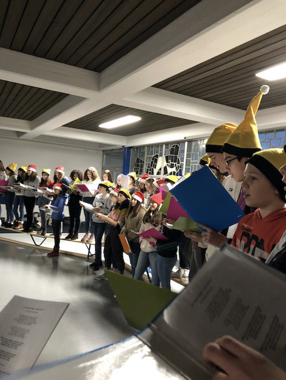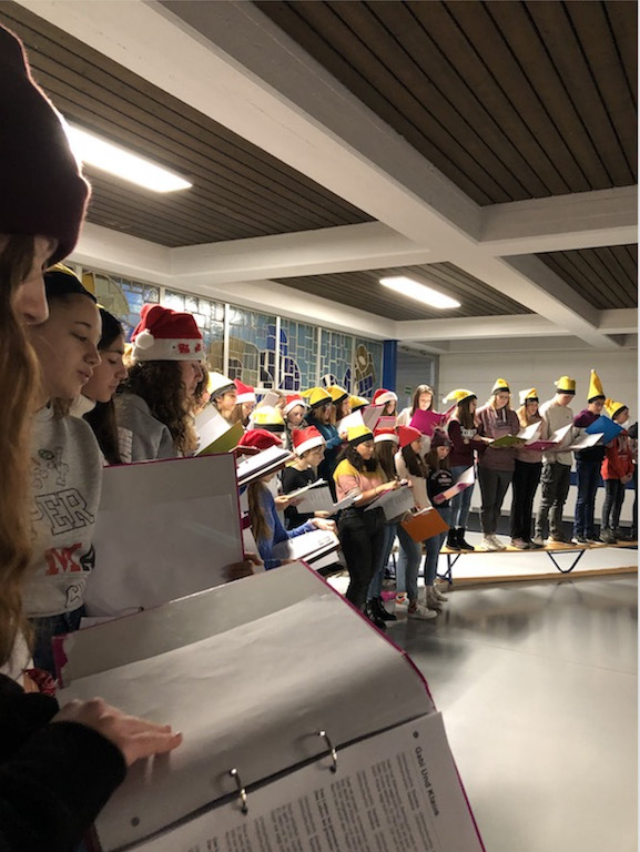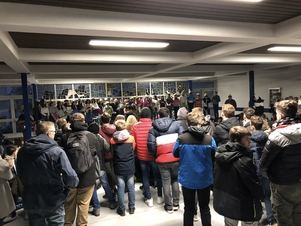 Und als dann die Schulglocke ertönte, versammelte sich die ganze Schule in der Eingangshalle, wo sich der Chor der Kreisschule bereits aufgestellt hatte - offenbar sollte der Unterricht nicht wie sonst jeden Freitag beginnen. Man setzte sich, rückte zusammen, trank noch einen Schluck Punsch zu einem Bissen Bänzli und freute sich auf die Darbietung des Chors.
