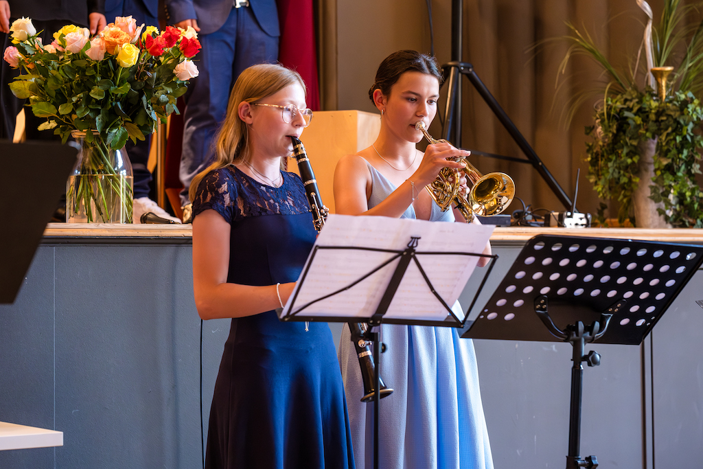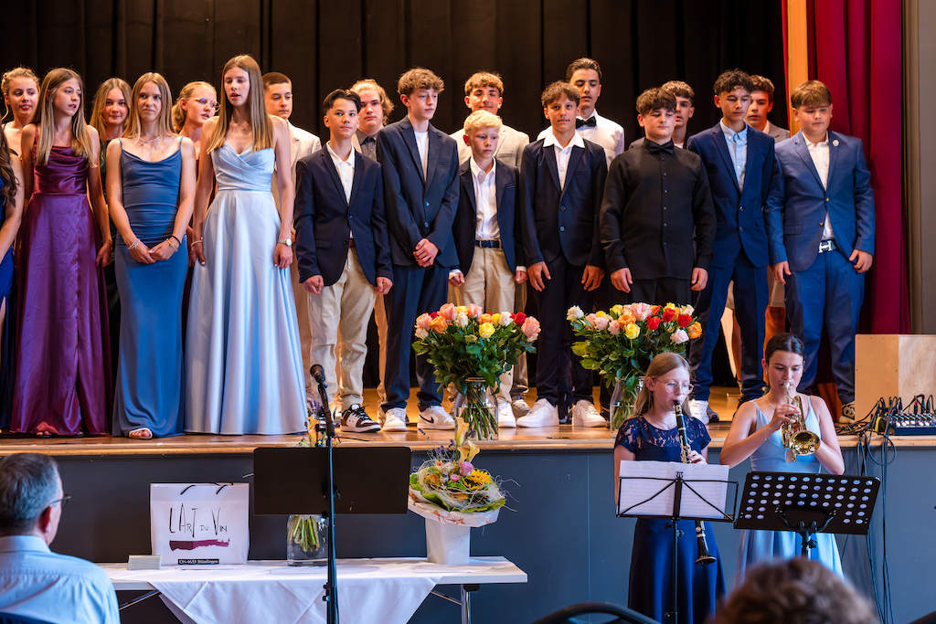 Zum Auftakt der Feier sangen die Klasse P2ab das Lied mit dem Titel Auf uns von Andreas Bourani, wobei sie einen eigenen Text unterlegten. Musikalisch begleiteten Sophie Baumann an der Klarinette und Sophia Nussbaumer am Cornett zusammen mit ihrer Musiklehrerin Iona Haueter am Klavier. Sie erhielten dafür den verdienten Applaus aller Anwesenden.