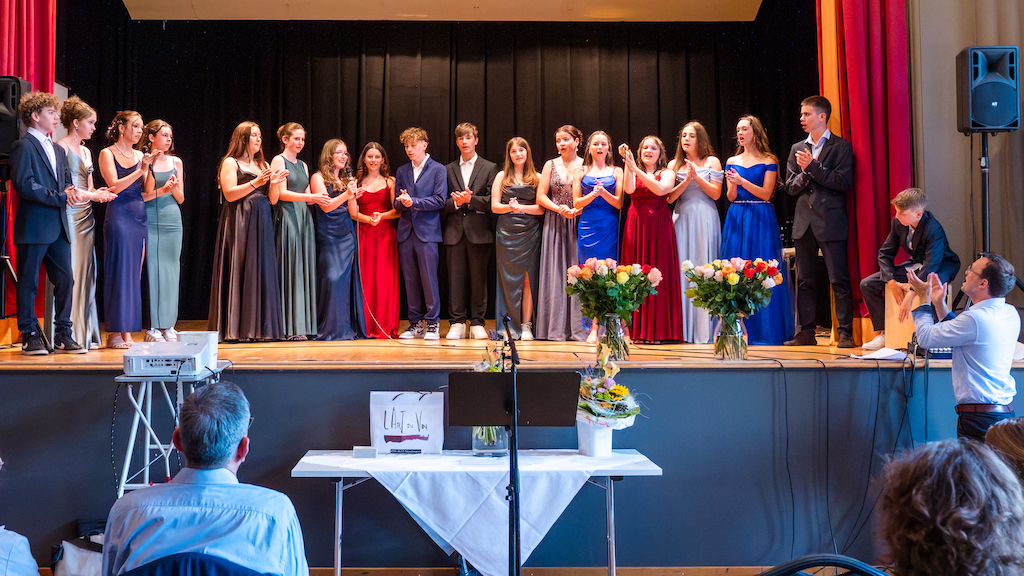 Besondere Aufmerksamkeit erhielt die Ansprache von Rebekka Salm, Buchautorin aus Olten. In Gedanken und mit Selbstportrait begab sie sich ins Jahr 1996 – damals stand sie selbst am selben Punkt wie die austretenden Schüler/-innen. Sie erinnerte sich an die Gedanken, Träume, Absichten, aber auch Unsicherheiten und Zweifel, welche sie damals als Teenagerin begleitetet haben und zeigte Schritt für Schritt auf, wie sich ihr Leben ab 1996 entwickelte. Dabei philosophierte sie wunderbar offen über Lebensschritte, die nur scheinbar glücklich und zufrieden gemacht haben oder eben solche, die ganz echte Glücksgefühle auslösten. Als markante Schnittstellen im Leben machte sie jene aus, für welche sie Mut und Zuversicht brauchte – es waren Schritte, bei denen sie weniger auf das Umfeld als auf sich selbst gehört und vertraut hatte. Zahlreiche Anwesende haben sich in Teilen der von ihr geschilderten Situationen wiedererkannt und abgeholt gefühlt. Zurecht erhielt sie für ihre ausgelegten Gedankenwelten den verdienten Applaus!