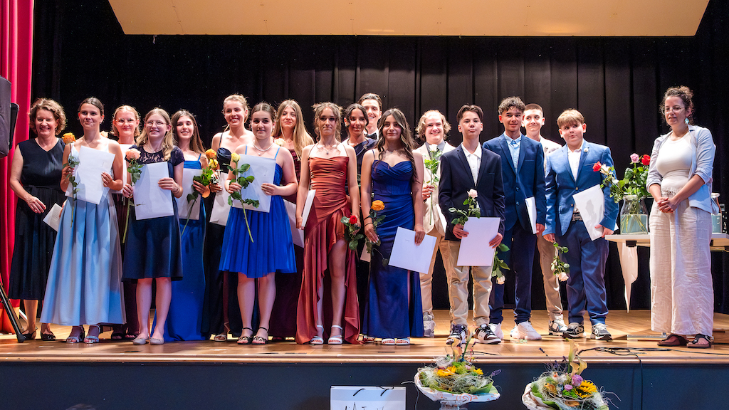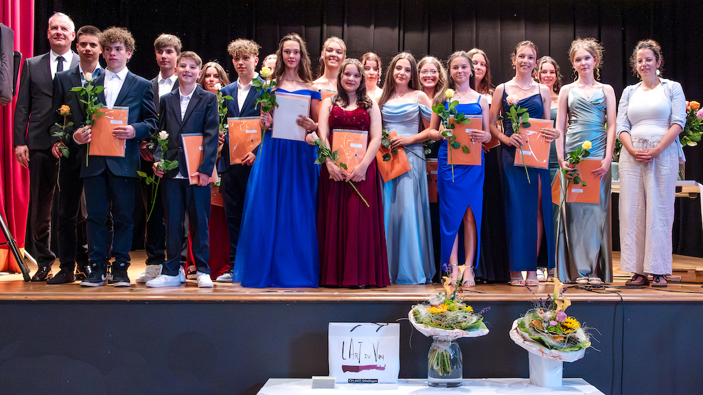 Zur eigentlichen Zeugnisübergabe wurden die Schülerinnen und Schüler klassenweise zusammen mit ihren Klassenlehrpersonen auf die Bühne des Casinosaals gebeten, wo sie aus den Händen der Klassenlehrpersonen und Rebekka Salm zusammen mit dem Zeugnis eine Rose erhielten. Die Zeugnisübergabe wurde durch die Schülerinnen Giulia Pedrocchi (Klavier), Varvara Luneva (Klavier), Ronja Schmid und Lilly Meili (Gitarre) und Leonie Zürcher (Klavier) musikalisch untermalt.