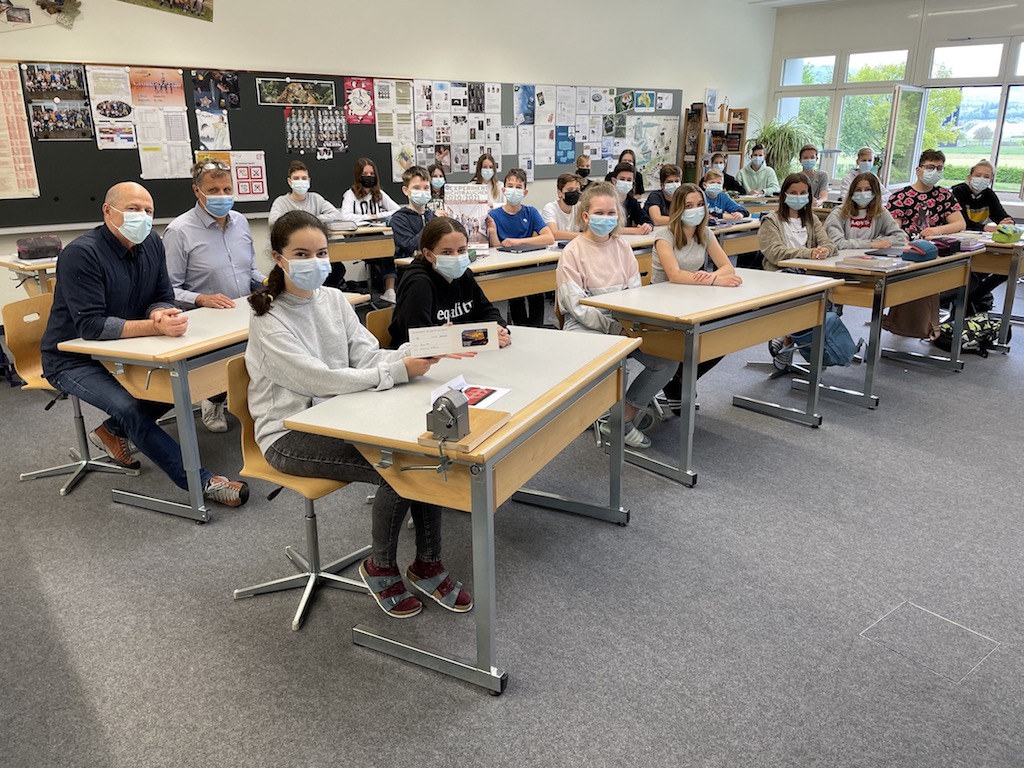 Bild: Am Donnerstagmorgen, 19.05.2021 kam dann Christophe Gut von der Lungenliga des Kantons Solothurn und langjähriger Präventionsmitarbeiter an der Kreisschule Mittelgösgen überraschend vorbei und überbrachte der Klasse P1c den Reisegutschein. Selbstverständlich musste dieser Moment fotografisch festgehalten werden.