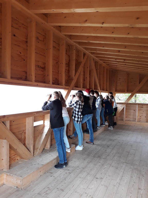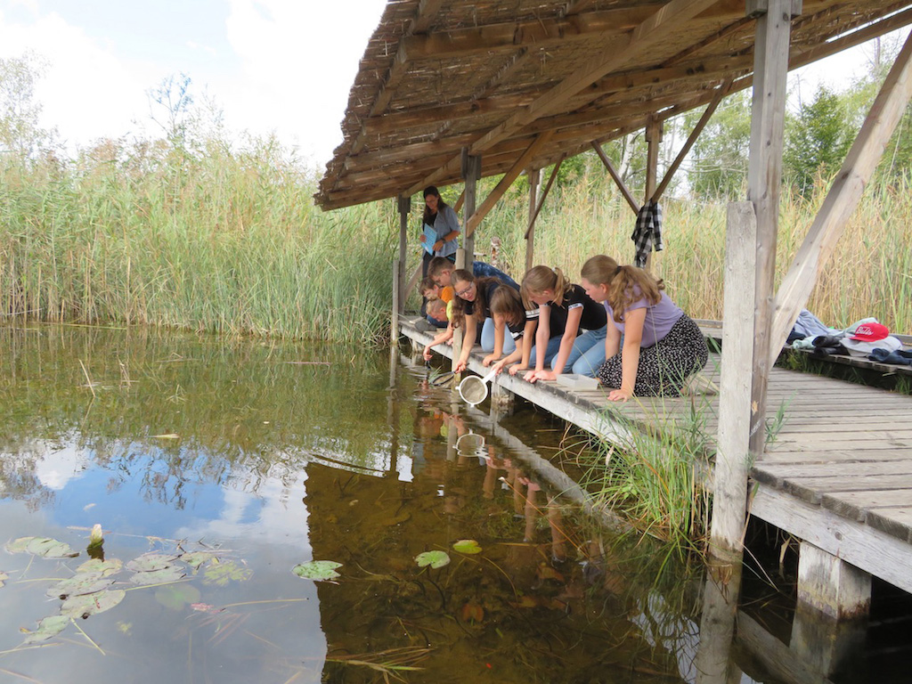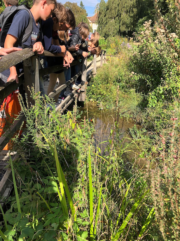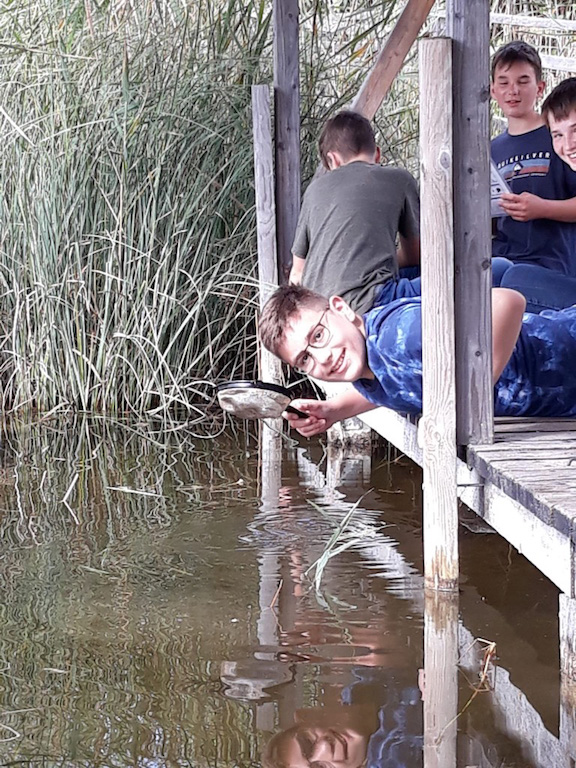 Nachdem wir den Lunch fertig gegessen hatten, brachen wir auf zum Pro Natura Zentrum. Dort gab es zwei Gruppen: eine wurde deutsch begleitet, die andere französisch. Auf Holzpfaden liefen wir in den Schilfgürtel „La Grande Cariçaie“ und sahen überall Frösche und andere Sumpflebewesen. Wir stiegen auch auf einem Ausguck und sahen die ganze Sumpfregion und den See. Auch mussten wir kleine Tiere mit Hilfe eines Siebes und einem mit Wasser befüllten Behälter aus einem kleinen Teich herausfischen und untersuchen. Als wir nach ca. zwei Stunden fertig waren, liefen wir wieder zu unserem Haus zurück. Um 18 Uhr gab es wie gewohnt das Abendessen: Spaghetti Bolognese. Zum Dessert gab es Vanilleeis mit einem kleinen Apfelkuchen und Rahm.