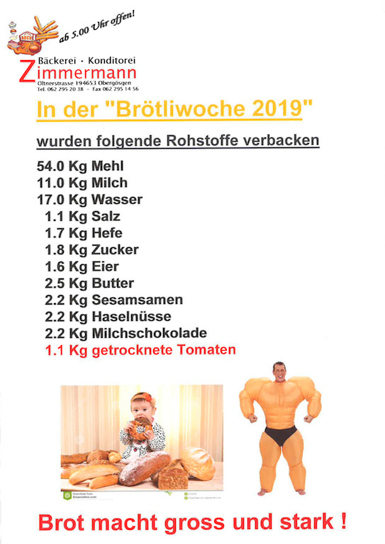 In der Woche vom 21. - 25. Januar 2019 verwöhnte die Lehrtochter der Bäckerei Zimmermann in Obergösgen, Milena Näf, zusammen mit ihrem Chef die 263 Schüler der Kreisschule Mittelgösgen in jeder Morgenpause mit einem feinen Brötli. Im Namen aller Geniesser bedankt sich die Schulleitung ganz herzlich für das tolle Projekt.